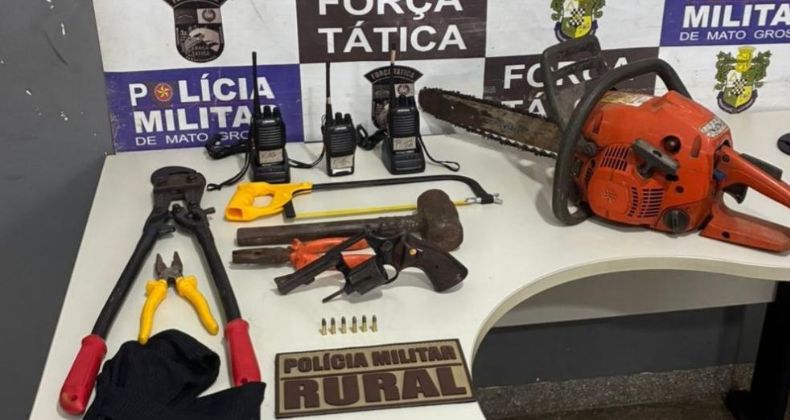 Em busca veicular, os policiais militares apreenderam uma arma de fogo com seis munições calibre .22, dois alicates, três alicates, uma motosserra, uma marreta, um arco com segueta, três rádios comunicadores com dois carregadores e uma balaclava. As equipes entraram em contato com o proprietário dos animais para que o buscassem posteriormente.